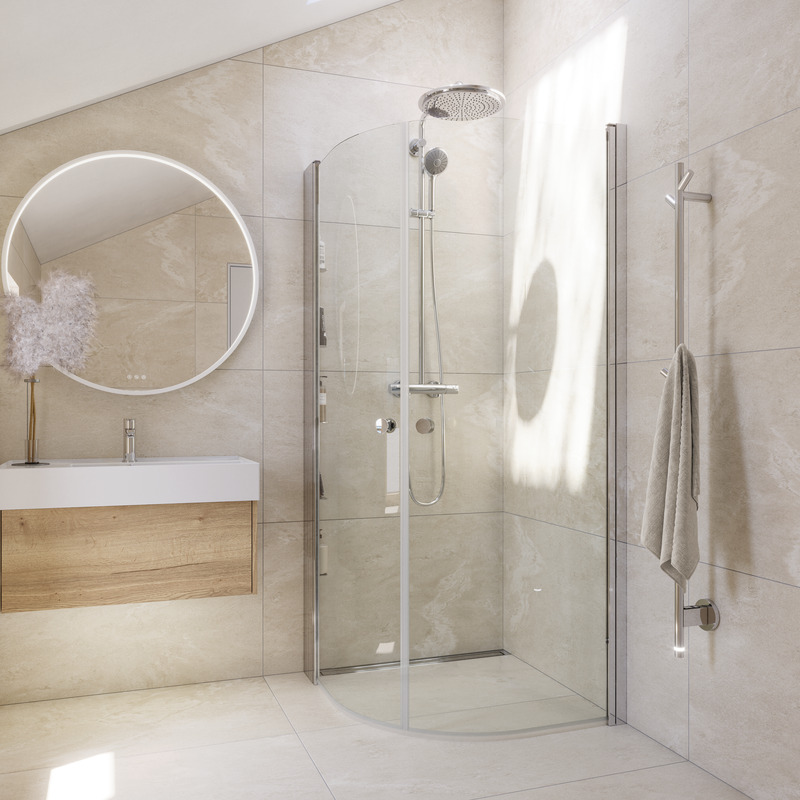 Enkel och snygg duschlösning med två halvrunda duschdörrar, som inte tar mycket plats när du duschar och kan fällas ända in till väggen när duschdörrarna inte används.