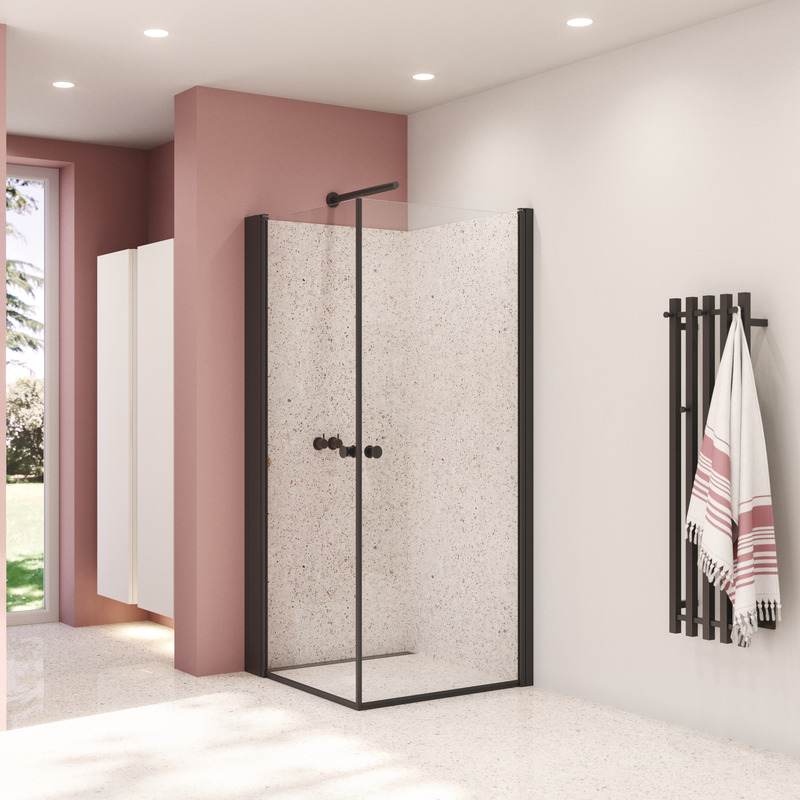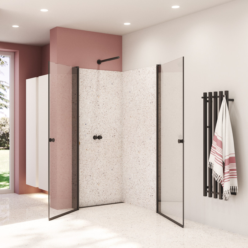 Vikfunktionen ger – förutom en stor öppning – plats för armaturen när dörren fälls in mot väggen. Den smarta vikdörren löser även problemet med vatten på golvet när du öppnar dörren. Dörren viks på mitten så att vattendropparna stannar kvar i duschutrymmet.