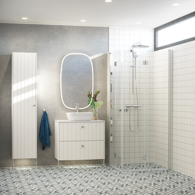 Denna kombination med 2 fasta väggar och 2 slagdörrar är ytterligare ett av de många bra alternativen med Flexi. Här kan du placera duschen nära möblerna och samtidigt fälla in dörrarna när duschhörnan inte används. Smart.