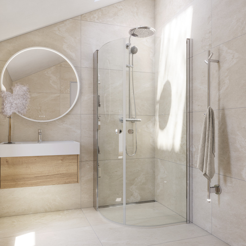 En halvrund duschhörna har fördelen att den inte tar lika mycket plats som en fyrkantig. Här är det mer armbågsutrymme i badrummet och när duschhörnan inte används kan dörrarna fällas in hela vägen och ge extra utrymme.