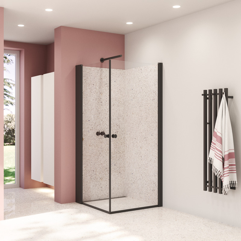 En mycket enkel look med de smala svarta profilerna och 2 praktiska slagdörrar. Slagdörrarna kan öppnas både utåt och inåt, så de kan skjutas undan när man inte duschar.