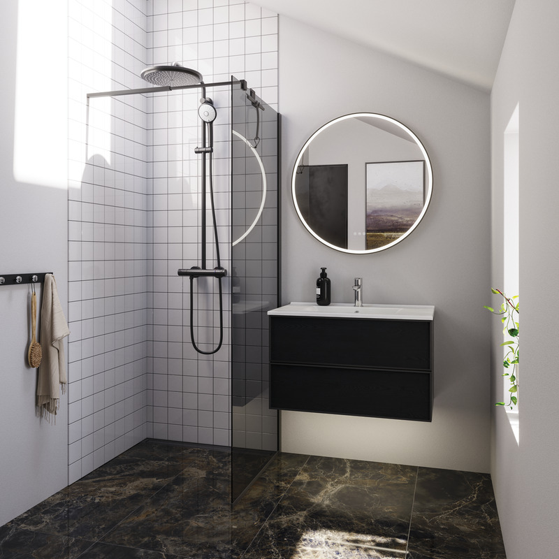 Med skärmväggar i glas är du fri att öppna och stänga dörrar, du behöver inte låsa in dig. Väljer du modellen med 2 skärmväggar enligt nedan slipper du även vatten i resten av badrummet.